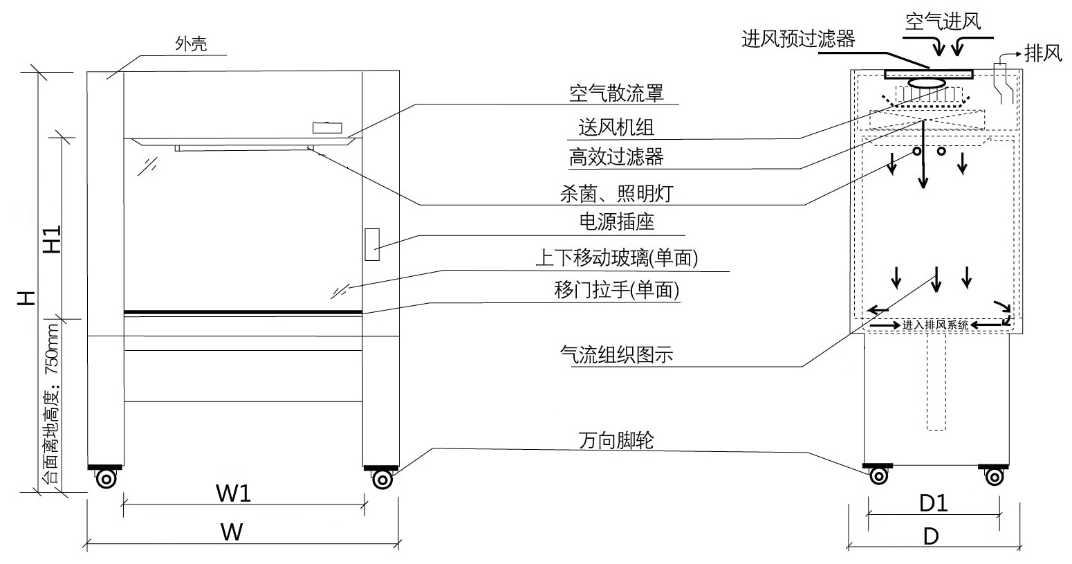 凈化工作臺由箱體、風機、高效過濾器、操作開關等幾大部件組成。箱體采用彩鋼板等制作,表面噴塑處理,工作臺面采用不銹鋼制作。凈化單元采用了可調(diào)風量的風機系統(tǒng),通過調(diào)節(jié)風機的工作狀態(tài),可使?jié)崈艄ぷ鲄^(qū)中的平均風速保持額定范圍內(nèi),而且有效地延長了高效過濾器使用壽命。